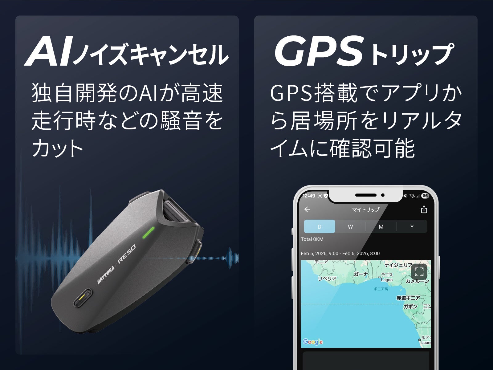 Reso独自開発のAIノイズキャンセルが高速走行時などの騒音をカット。アクションカメラとの音声連携も可能です。GPSトリップレコード機能により走行を開始すると位置情報を自動的に記録。GPSとジャイロセンサーによるSOS発信機能も搭載しています。