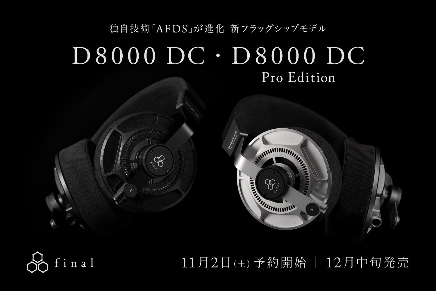 国内オーディオメーカー株式会社final(代表:細尾 満、本社:神奈川県川崎市)は、独自の振動板制動技術「AFDS:エアフィルムダンピングシステム*」(以下、AFDS)を搭載したフラッグシップヘッドホン「D8000 DC」と「D8000 DC Pro Edition」の予約を2024年11月2日(土)より開始、12月中旬より発売いたします。