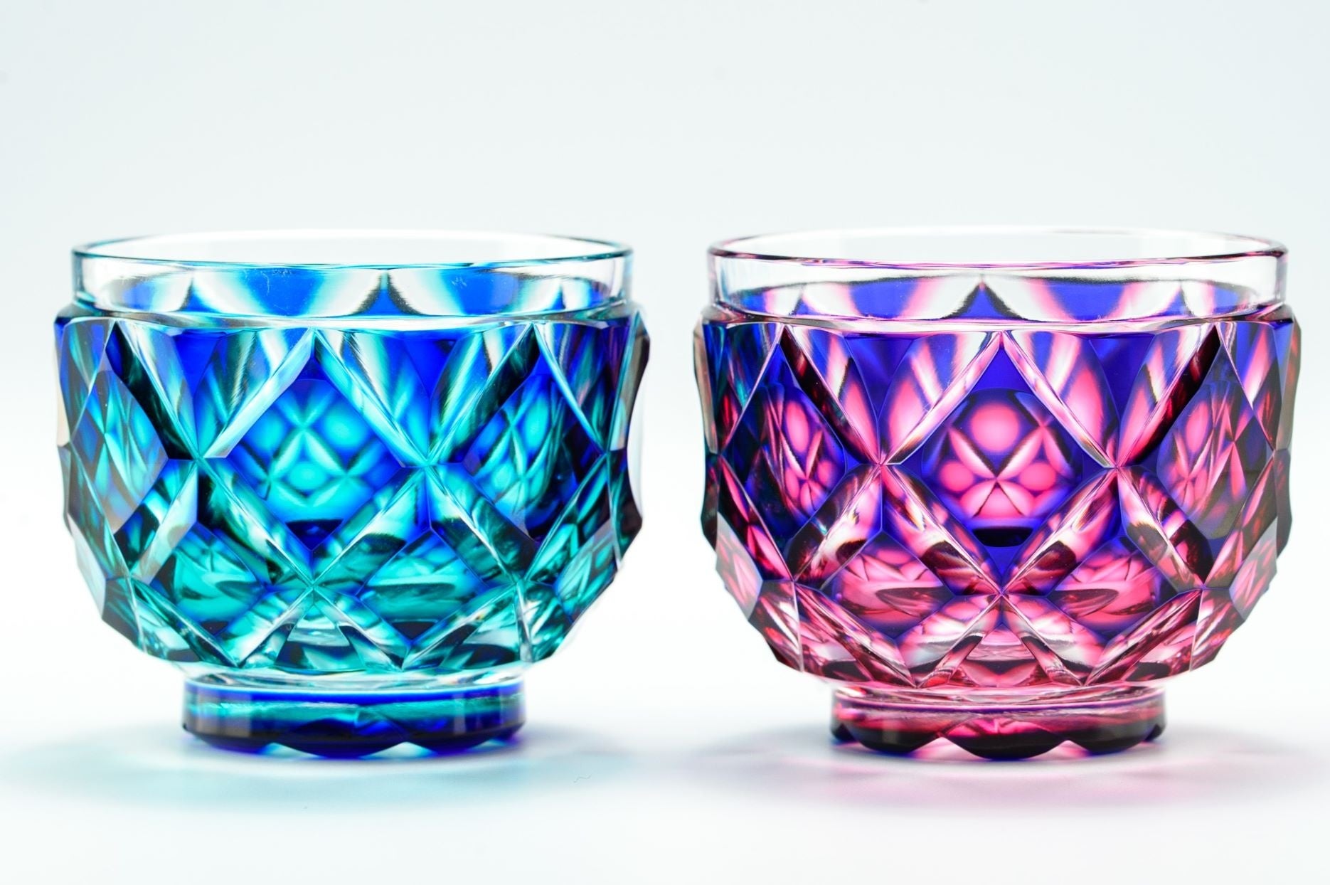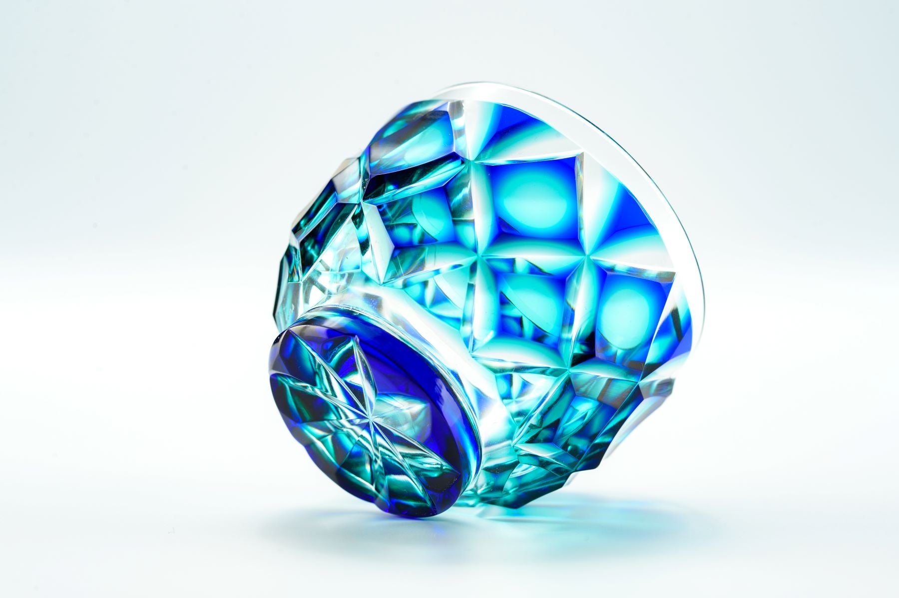 2つの色を被せる事で、単色では表せない吹きガラスの奥深さ、切子の繊細さを表現している逸品。