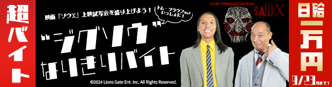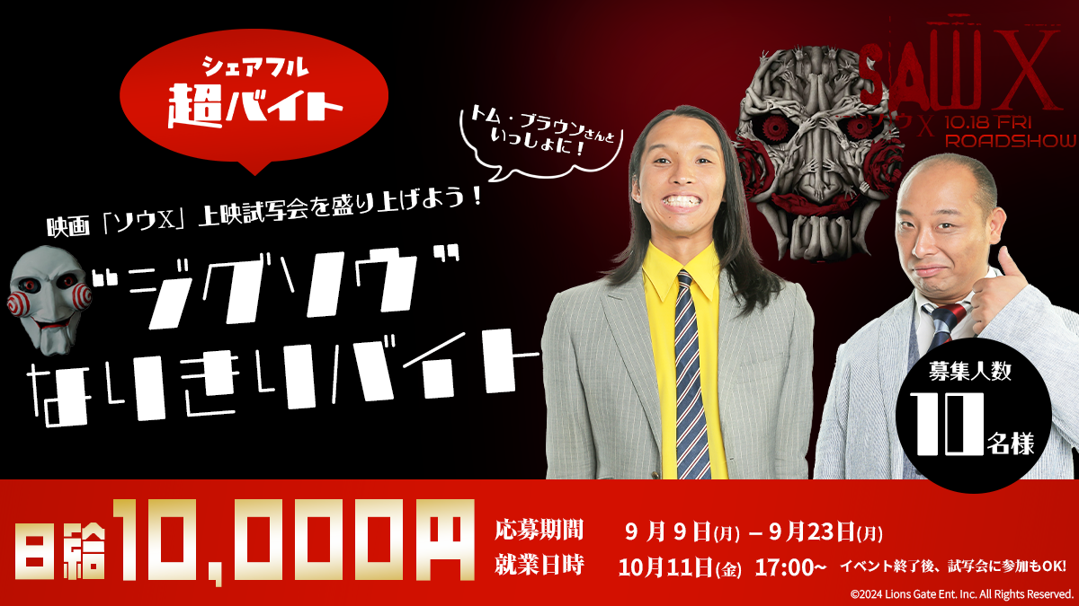 10月11日(金)に実施の映画『ソウX』公開記念試写会イベントにて、ゲストのトム・ブラウンさんと一緒に会場を盛り上げる超バイトを9月23日(月)まで募集中です。ご当選された方には当日、“ジグソウ”の仮面をつけイベントを盛り上げるお仕事をお願いします。イベント終了後の試写会にもご参加いただけるので、ホラー好きな方は上記キャンペーンとともにぜひご応募ください。