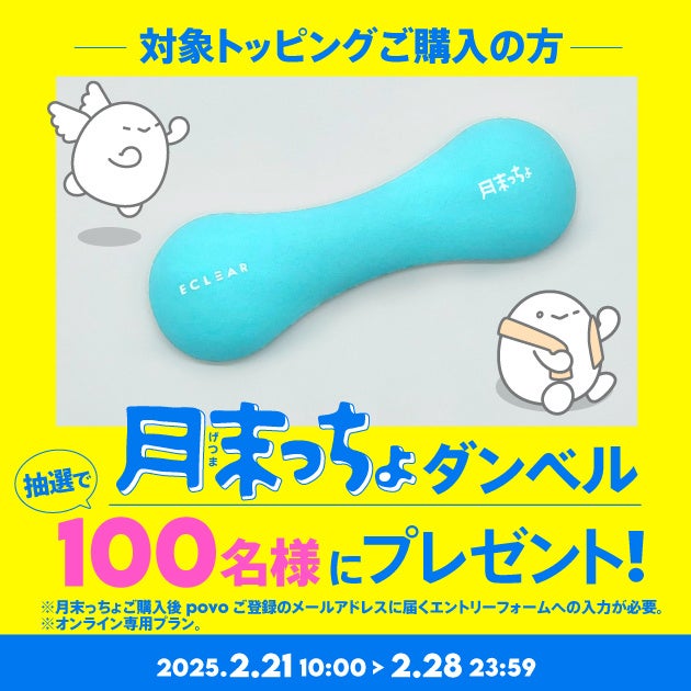 筋肉のちょい足しができるpovoのオリジナルダンベル「月末っちょダンベル」が抽選で100名にあたるキャンペーンを実施します。「月末っちょ」トッピングを購入のうえ、2025年2月28日までに特設サイトから応募いただいたお客さまが対象です。