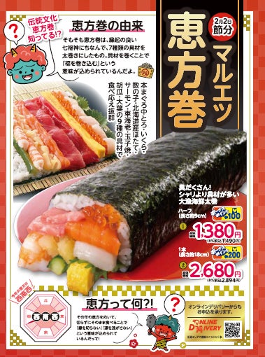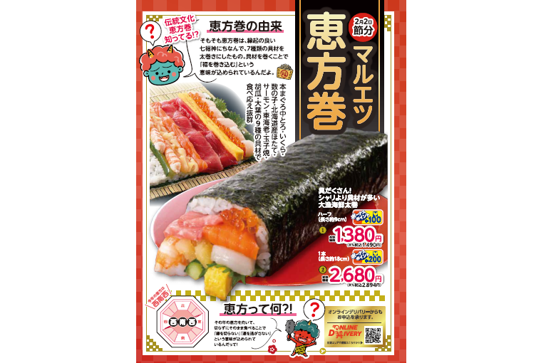 マルエツは、2025年『マルエツの恵方巻』のご予約承りを、12月28日(土)から店舗(一部店舗を除く)およびネットスーパー『オンラインデリバリー』(※)で開始いたします。