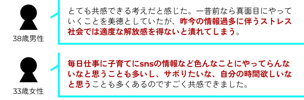 これは、目に見えない息苦しさが続く現代において、生活者が「サボり」を堂々と解禁することで、真面目すぎる自分からの解放や日常に小さな刺激をもたらす時間を求めているという見立てです。