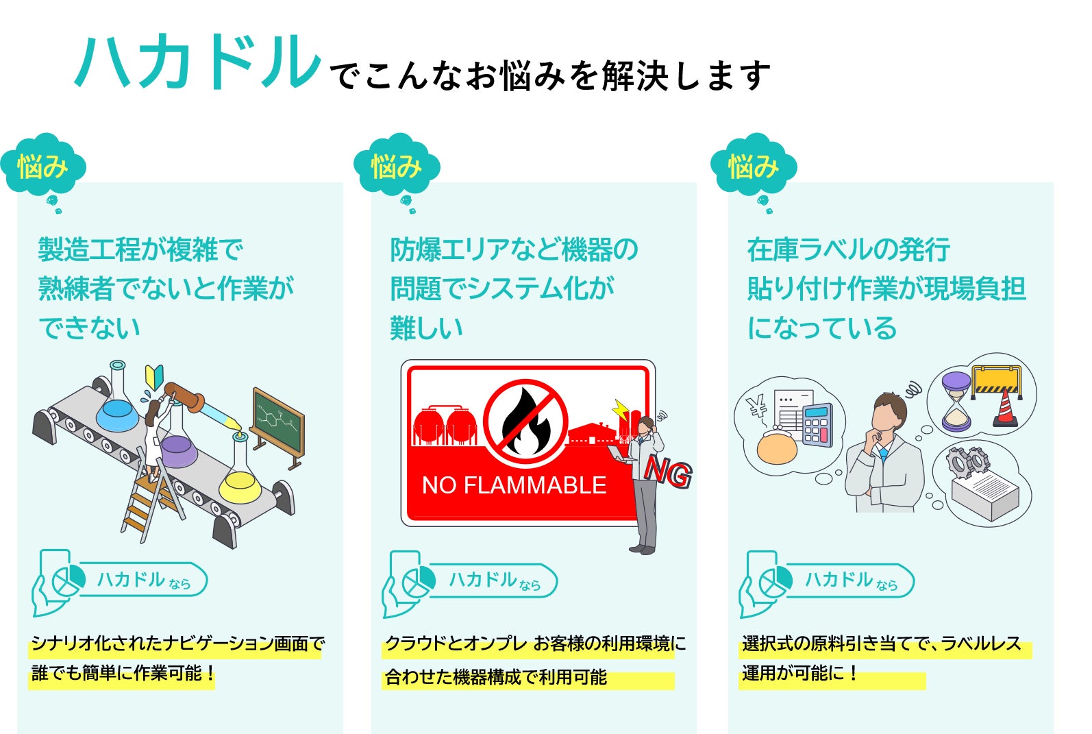 ハカドルは、製造計量現場の作業工程をスマホで丸ごとナビゲートします。手順に沿った操作でミスやロスを解消し、誰でもスムーズに同じ品質を実現できるシステムです。