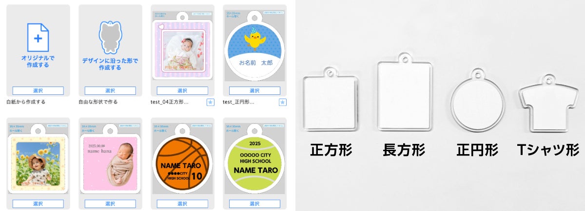 お子様のネームプレートとして利用できるデザインや、部活動をモチーフにしたデザインなど、使いやすいテンプレートを多数ご用意しております。キーホルダーの形状は、正方形、長方形、正円形、Tシャツ形の4パターンからお選びいただけます。