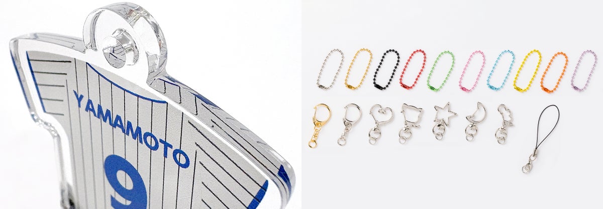 当社のアクリルキーホルダーは、高発色なUV印刷による鮮明な仕上がりと、「アイスメルトカット方式」による滑らかな断面が特長です。ストラップは18種の豊富なバリエーションから、無料で1つをご選択いただけます。
