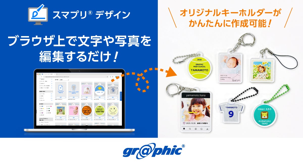 専門知識不要でオリジナルのアクキーを簡単に作成可能。ネット印刷のグラフィックが「スマプリ®デザイン」にアクリルキーホルダーのデザインテンプレートを追加。