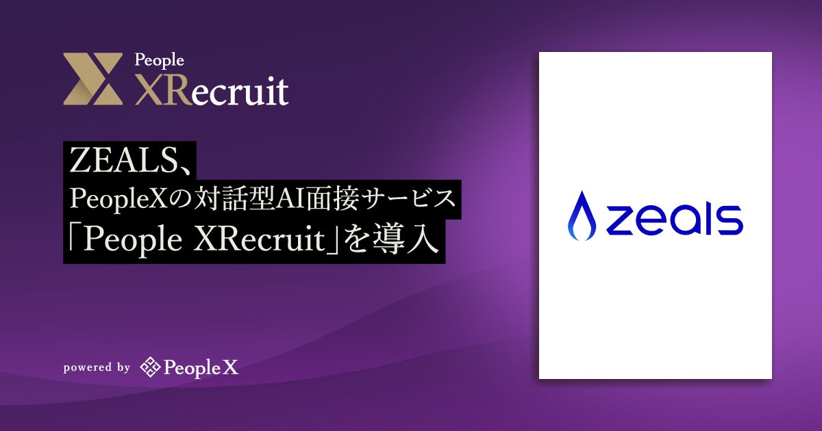 採用から活躍支援まで、AIで人事課題を解決する株式会社PeopleX(本社:東京都新宿区、代表取締役 CEO:橘 大地、以下:当社)は、株式会社ZEALS(東京オフィス:東京都目黒区、代表取締役 CEO:清水 正大)に、当社が提供するデジタルヒューマンによる対話型AI面接サービス「People XRrecruit(ピープル・クロスリクルート)」を導入いただく運びとなりましたことをお知らせいたします。