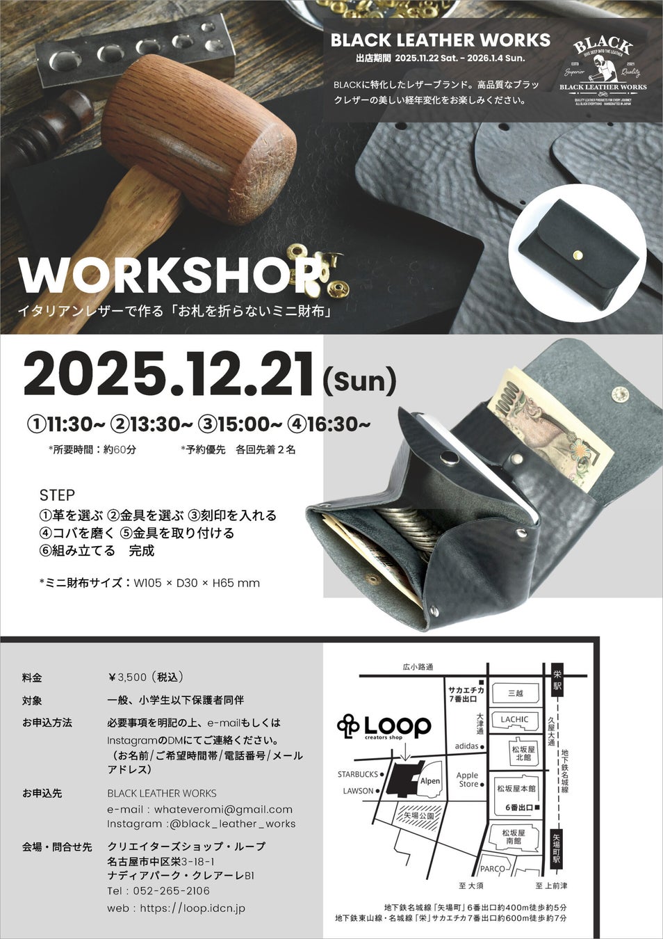 出店期間中には、イタリアンレザーでミニウォレットをつくるワークショップも開催予定です。この機会に是非ご参加ください。