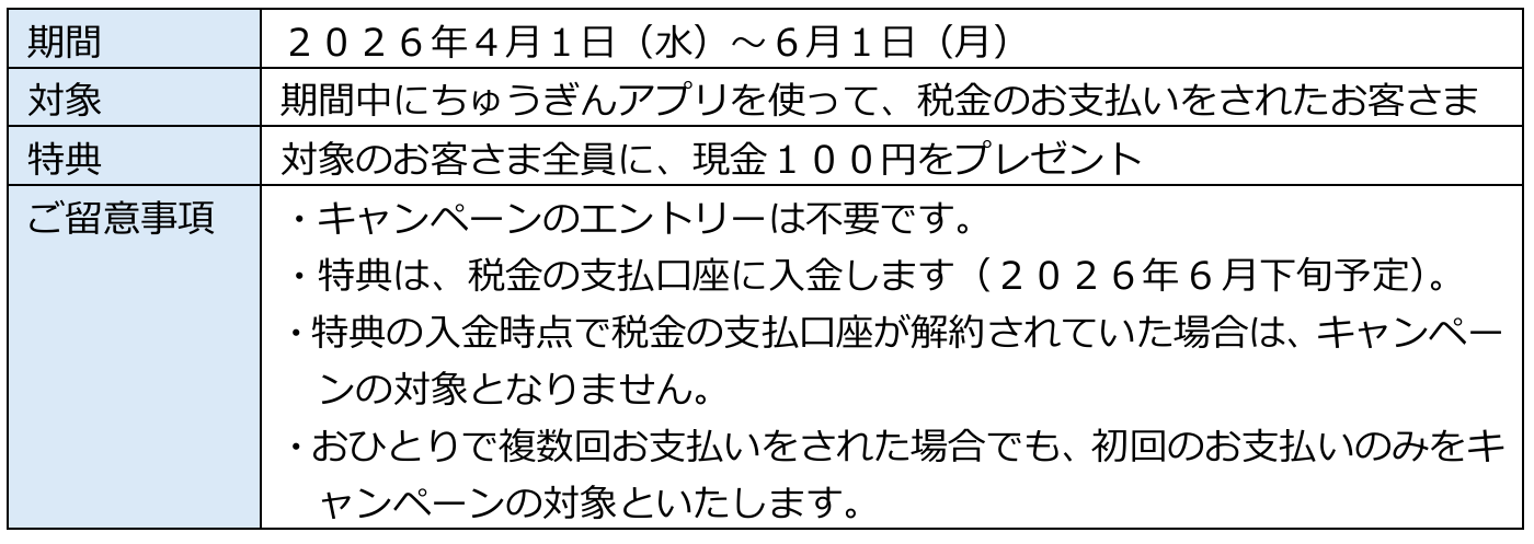 本キャンペーンでは、「ちゅうぎんアプリ」を利用して税金のお支払いをされたお客さま全員に、現金100円をプレゼントいたします。
