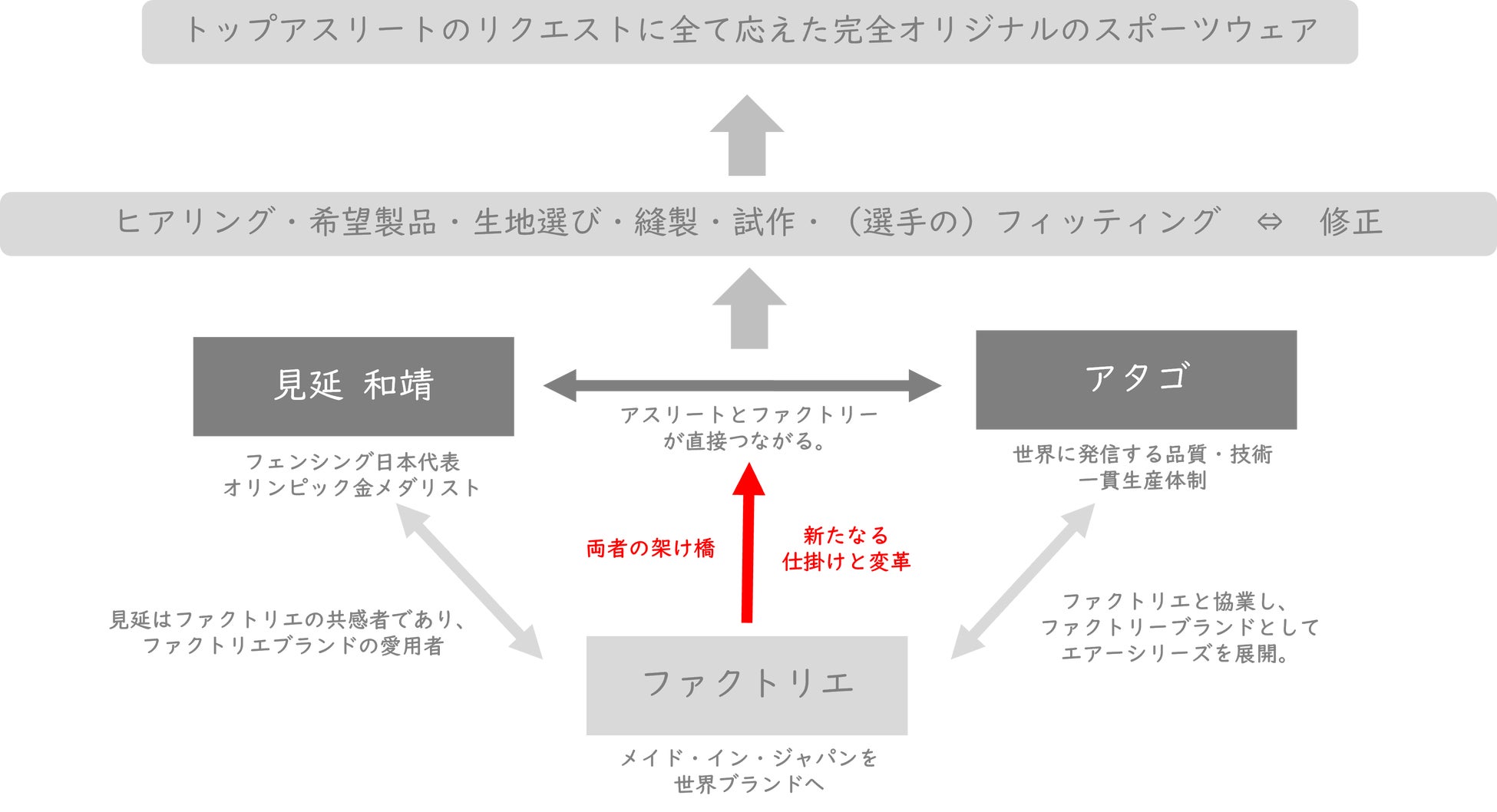 見延選手と初めてお会いしたのは2019年の夏頃でした。ちょうど見延選手がエペの年間ランキング1位で世界王者になったタイミングでしたので、日本人として大変感銘を受けました。私は若い頃にパリでラグジュアリーブランドと出会い、エルメスやグッチが工房から生まれたことを知り、日本のものづくりから世界ブランドを作りたいと思ってファクトリエを始めました。ところが見延選手はもうすでに世界一をやってのけていたのです(フェンシングはフランスの国技ですので、鼻を明かした思いでした)。見延選手は当時から越前市のふるさと大使を務めるなど、地元とものづくりへの想いが強く、ファクトリエの商品も愛用してくださっていました。試合はもちろん、長時間の移動やトレーニングに集中するため等、ウェアへの意識が高く、自分に本当に合ったものを着用したいという話を聞き、福井に素晴らしいスポーツウェアを作る工場がある話をしたことからプロジェクトがスタートしました。移動用としてはファクトリエが企画デザインと協業して作ってきたデザイン性と伸縮性を両立した「エアーシリーズ」を、トレーニング用としてはアタゴ社のスポーツウェアの叡智を集結したウェアを彼専用に作りました。見延選手は遠征の合間をぬって福井の工場まで足を運んでいただき、アタゴ社のみなさまは細かな数センチ単位の修正を何度も繰り返していただきました。大変お忙しい中、ご協力いただいた両者には心から感謝を申し上げます。