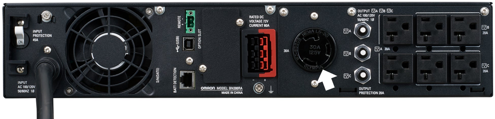 ・BN300RAは、出力コンセントに30A形状プラグ(NEMA L5-30R:1個)を用意(白矢印部分)