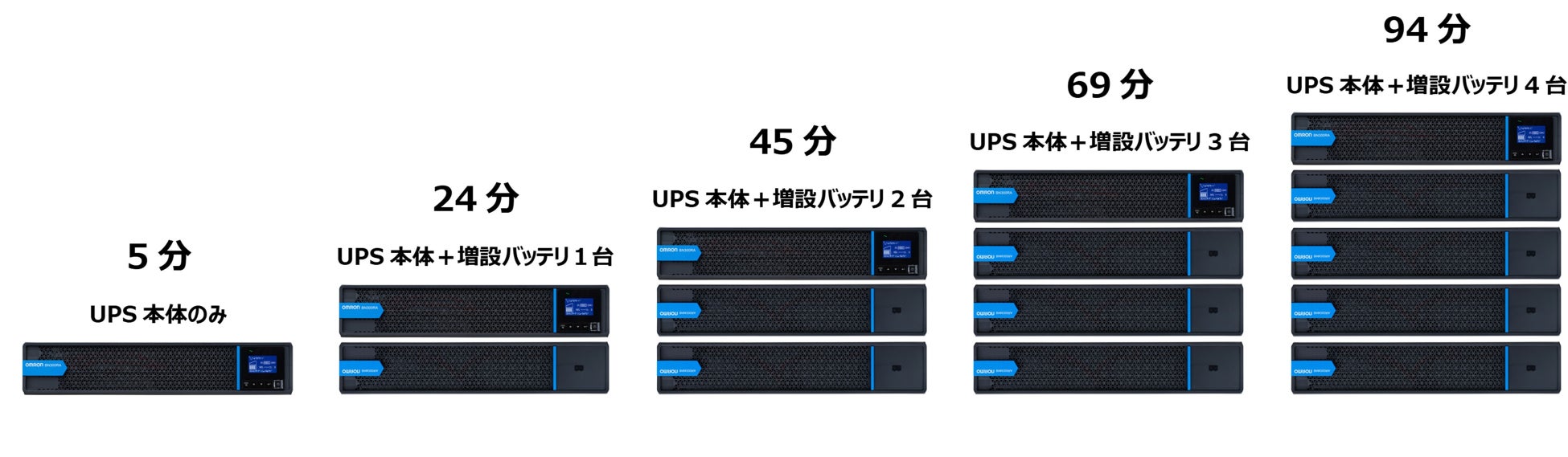 ・バッテリユニットを最大4台まで増設し、バックアップ時間を延長することができます。例えば2000WのサーバをBN300RAでバックアップした場合、次のようなバックアップ時間になります。