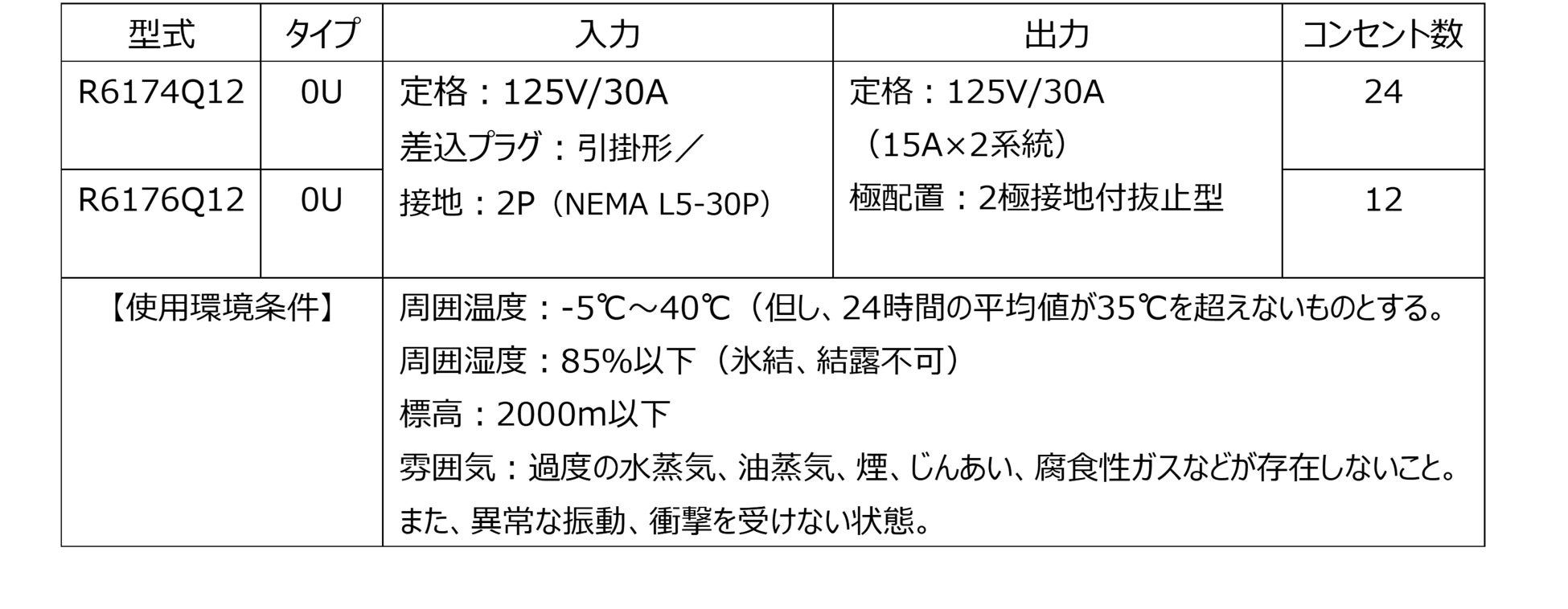 BN300RAの背面にある30A形状の出力コンセントには、当社より2024年4月(*1)に発売のPDU「型式:R6174Q12」と「型式:R6176Q12」を接続することができます。