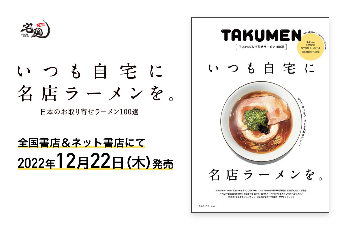 国内最大級のラーメン通販サイト「宅麺.com」(https://www.takumen.com/)を運営するグルメイノベーション株式会社(本社:東京都渋谷区、代表取締役社長:井上 琢磨)は、“宅麺のある生活”を提案する全く新しいライフスタイルムック『いつも自宅に名店ラーメンを。〜日本のお取り寄せラーメン100選〜』を全国書店&インターネット書店にて2022年12月22日(木)に発売いたします。