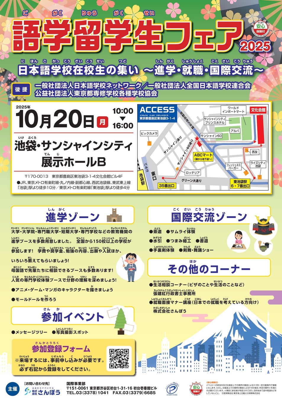 日本語教育機関に在籍する外国人留学生を対象に進路情報の提供を行う株式会社さんぽう(本社:東京都渋谷区/代表取締役社長:渡邉王雄)は、10月20日(月)に池袋・サンシャインシティにて「語学留学生フェア2025~進学・就職・国際交流~」を開催する。対象は国内の日本語教育機関に在籍する外国人留学生で、4000名以上の来場を予定している。参加費無料。入退場自由。