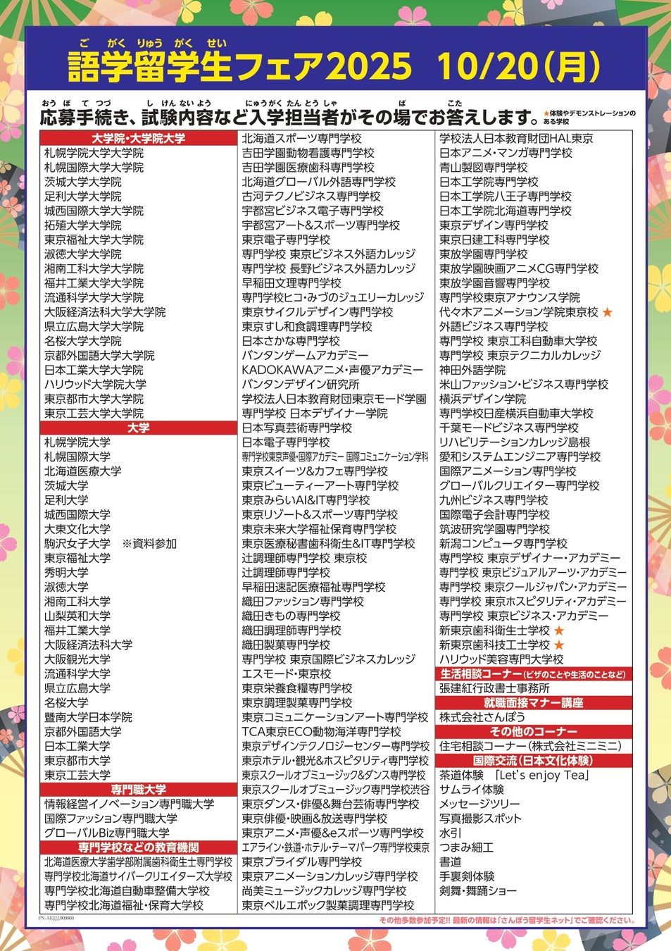 当イベントは、150以上の私立大学・専門学校・企業が参加し、2024年には2000名以上の来場実績がある。留学生にとっては、各大学・専門学校の教授や入試担当者から、それぞれの学校の特色や学びの特徴、入試の傾向と対策などに関する最新の情報を得られる絶好の機会となっている。学校ブースの他には、行政書士による生活相談コーナーや、留学生対象の住宅紹介企業なども参加する。また、就職希望者向けの相談コーナーや企業ブースも設け、学生の幅広い進路希望を叶えるイベントになる。