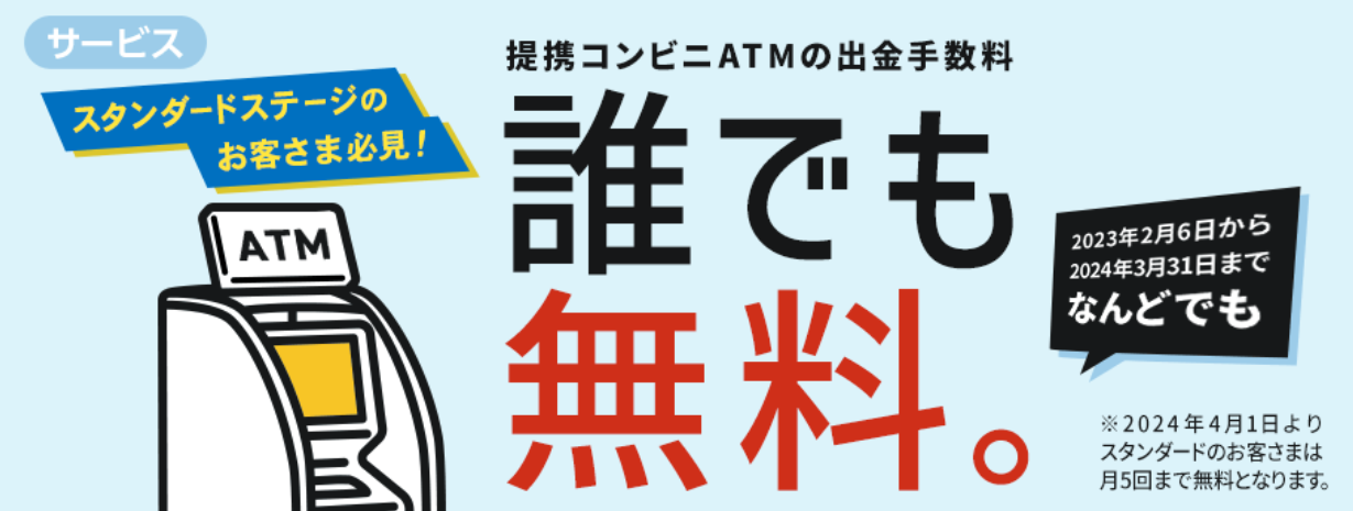 当行ではこれまで、提携コンビニでの ATM 手数料について、入金時は全てお客さまを無料としておりましたが、出金時には一部のお客さま(※1)にご負担をいただいておりました。この度これを改定し、全てのお客さまが提携コンビニ ATM を無料でご利用いただけるようにいたします。また SBI 新生銀行への商号変更を記念し、2023 年 2 月 6 日(月)から 2024年 3 月 31 日(日)までの期間は、全てのお客さまのコンビニ出金手数料について、月当たりの無料回数に制限を設けません。なおスタンダードステージのお客さまは、2024 年 4 月 1 日(月)以降は月 5 回まで無料となります。(詳細は下図参照)