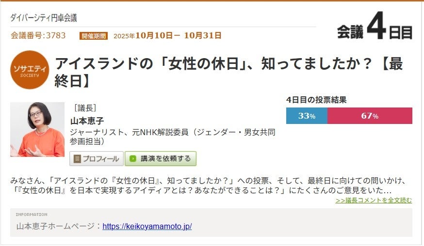働く人の多様な視点が集まる「ダイバーシティ円卓会議」。No.3783の会議テーマは、「アイスランドの『女性の休日』知ってますか?」。議長にジャーナリストであり元NHK解説委員の山本恵子氏を迎え、2025年10月10日(金)から31日(金)まで4回にわたり、オンラインでの議論を行いました。