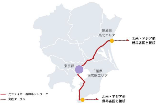 地上を経由するルートと比較し、東京港横断ルートは豊洲・有明エリアと芝浦・品川エリアを直線的に接続でき、より低遅延な通信を行うことが可能となります。アルテリアが提供する通信サービスでは、主要な海底ケーブルの終端である陸揚局が集中している千葉県南房総エリアおよび茨城県県北エリアへ容易に接続可能なため、海外への広帯域・低遅延の接続ニーズにもお応えします。