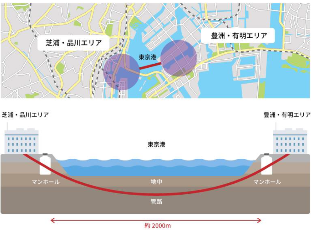 ※2 HDD工法(Horizontal Directional Drilling)は、石油掘削に用いられた技術を水平方向に応用した推進工法。地上からの掘削を最小限に抑え、地中を掘進機で掘り進めて管路を設置する。本プロジェクトでは東京港の防波堤や護岸構造物を侵さないよう、最大深度60m超での推進を実施する。通常の推進工法では約1,000mが限界と言われ、それ以上の距離に対応するにはシールド工法を用いるが、HDD工法を採用することで区間距離約2,000mの東京港を横断する推進工事を可能にし、短納期・低コスト・最短ルート(超低遅延)を実現する。