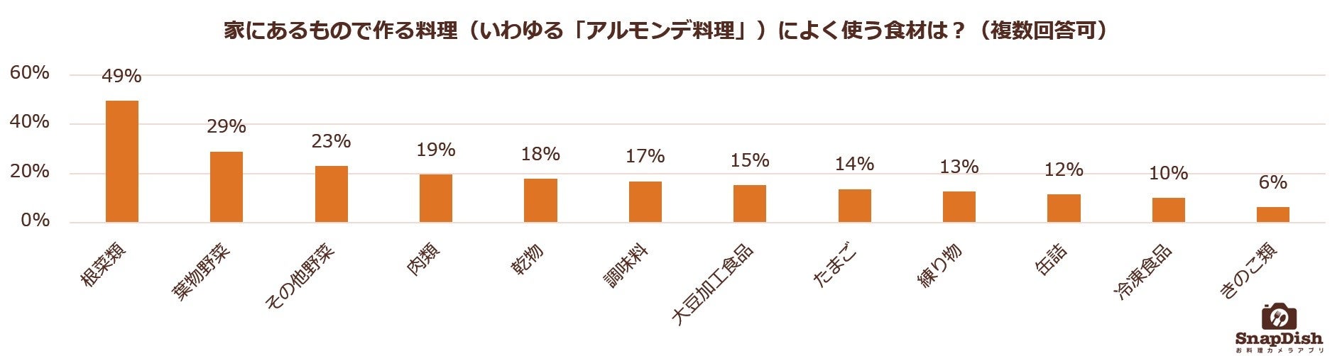 「アルモンデ」料理でよく使う食材については、最多は保存のききやすく普段から常備している家庭も多い「根菜類」(大根、人参、玉ねぎなど)、次いで、「葉物野菜」(キャベツ、白菜、小松菜など)、「その他野菜」(もやし、ネギ、ピーマンなど)、肉類(豚こま、鶏むね肉、ひき肉など)と続く結果となりました。
