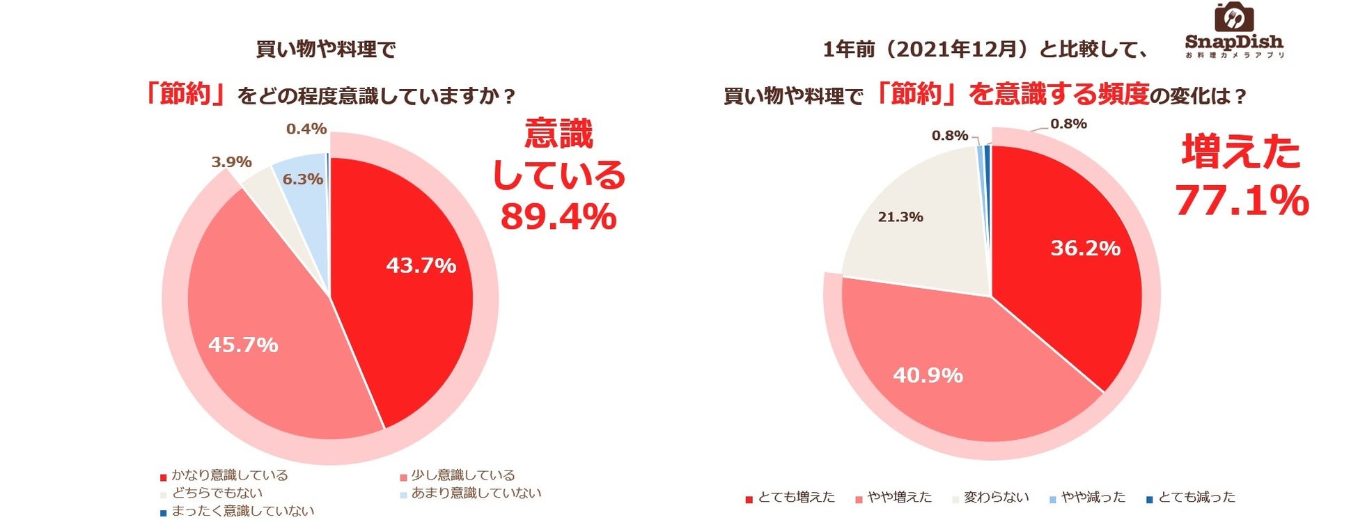 - 約90%が、買い物や料理で節約を意識、直近1年間で節約を意識する頻度が「増えた」人は77%に。