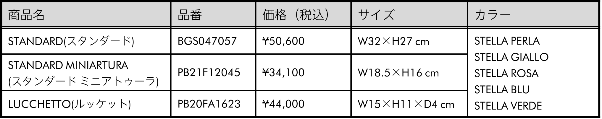 STANDARD MINIATURA(スタンダード ミニアトゥーラ) 品番:PB21F12045 価格:¥34,100(税込) サイズ:W: 18.5 H: 16 cm カラー:STELLA PERLA(ステッラホワイト)、STELLA GIALLO(ステッライエロー)、STELLA ROSA(ステッラピンク)、STELLA BLU(ステッラブルー)、STELLA VERDE(ステッラグリーン) |