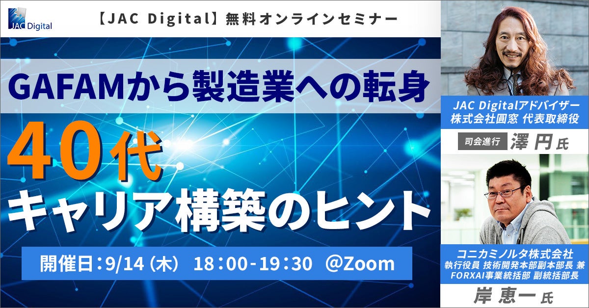 今回は、コニカミノルタ株式会社から執行役員 岸 恵一氏と、JAC Digitalアドバイザー澤 円氏にご登壇いただき、セミナーを開催します。お二人にはGAFAM出身で40代~50代にかけてキャリアの大きな選択をしているという共通点があります。