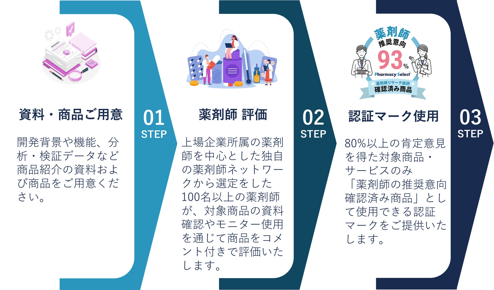 Pharmacy Select(https://pharmacyselect.jp/)は「シニアード」で培った調剤薬局ネットワークに所属する薬剤師が商品やサービスを客観的に評価し、基準を満たした場合「薬剤師の推奨意向確認済み商品」として認証マークをご提供するサービスとなります。