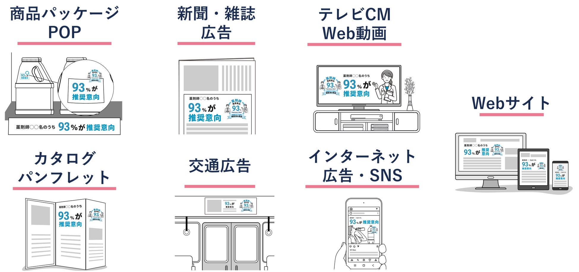 商品パッケージやPOPなど店頭での活用、テレビCMやネット、新聞、交通などの各種広告、パンフレットやポスターなど販促物まで、幅広いシーンで「薬剤師認証マーク」をご使用いただけます。