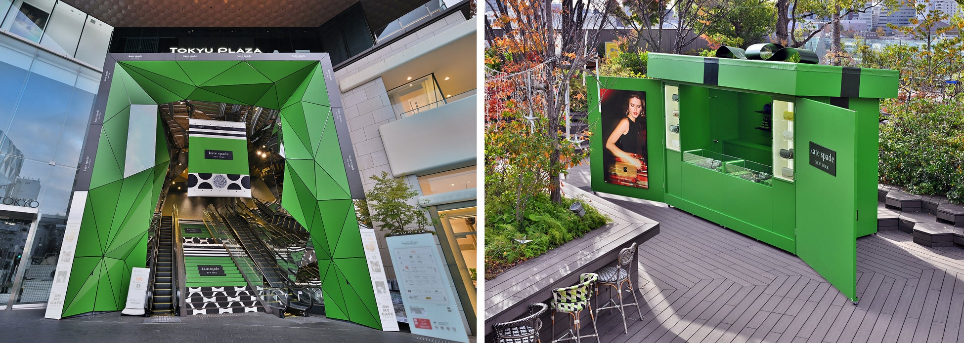 来場者は、同期間中、ブランドカラーのケイト・スペード グリーンやドット、ストライプなどのブランドコードがジャックする東急プラザ表参道原宿のエントランスを抜け、辿り着いた屋上テラスの幻想的なイルミネーションが煌めく都会の森の中でのショッピング、フォトスポットでの撮影を通して、シーズンテーマ“Adventures with friends”が表現している、イルミネーションが煌めく街へ、友人たちと冒険に繰り出す高揚感に溢れたフェスティブな世界観を体験出来ます。