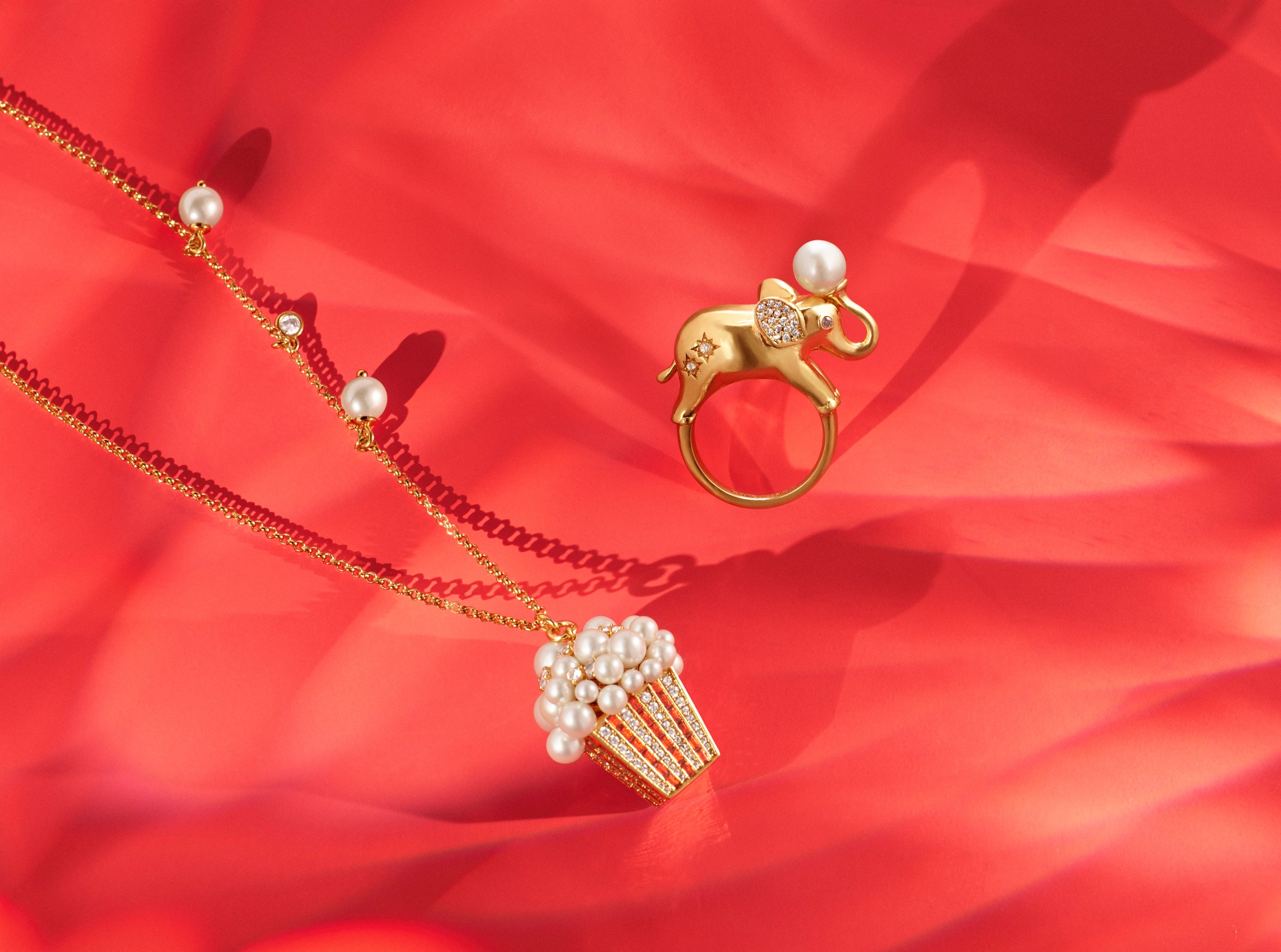 ホリデーシーズンに催されるウィンターカーニバルの主役、エレファントのエリーを モチーフにした遊び心に溢れたコレクション。パールで表現したパフォーマンス中のエリーのボールや、エリーの好物のピーナッツ、今にもはじけそうな観客用のポップコーンなど、楽しいモチーフが登場します。(写真上から) ウィンター カーニバル リング ¥28,600, ウィンター カーニバル ポップコーン ペンダント ¥28,600 ※全て税込み