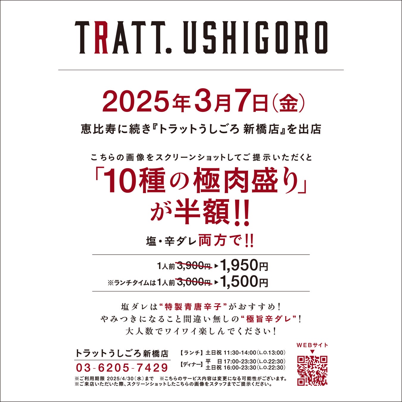 また、2号店の『TRATT. USHIGORO 新橋店』オープンを記念して、下記画像のスクリーンショットを保存して店舗でご提示いただくと、「10種の極肉盛り」が“半額”となるスクリーンショットキャンペーンを2025年4月30日(水)まで展開いたします。この機会に是非“焼肉うしごろ”が提案する新しい「町焼肉」をご体験ください。