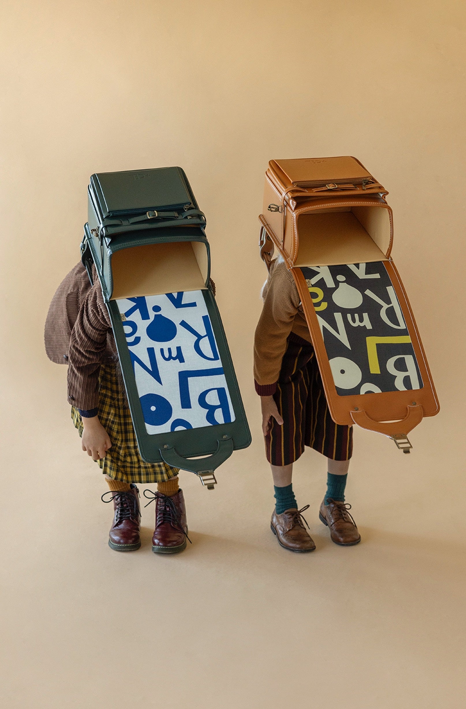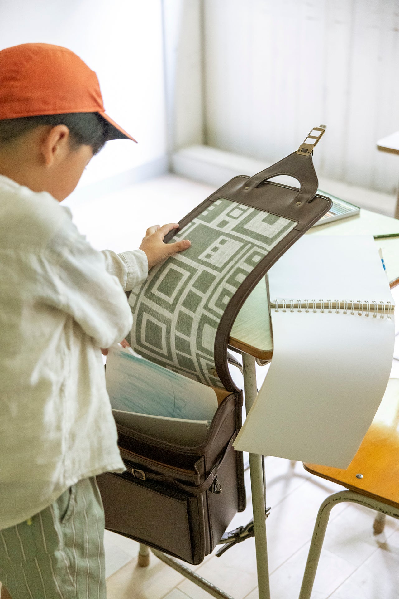 2025年4月に入学する子どもたちへ贈る2025年モデル「PLAIN」シリーズは、伝統的なフォルムを追求した佇まいは変わらず、新色としてブラウンとグリーンが加わりました。ランドセルの蓋であるかぶせ裏に染色家・柚木沙弥郎さんの作品もあしらい、毎日の開け閉めの時間を優しく彩ります。