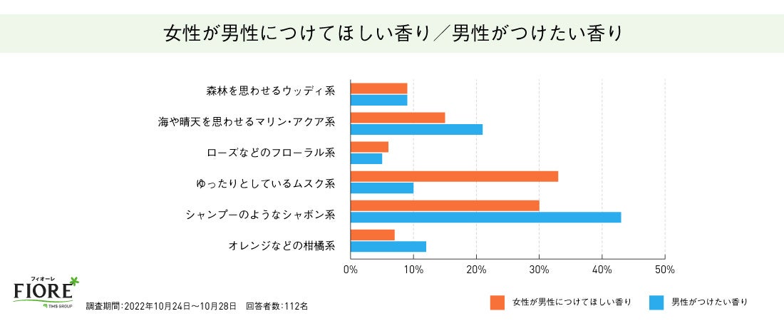 対して男性は「自分がつけたい香り」として柑橘系:12%、シャボン系:43%、ムスク系:10%、フローラル系:5%、マリン・アクア系:21%、ウッディ系:9%となっており、特に女性の求める香りとはシャボン系とムスク系で大きな違いが見受けられました。