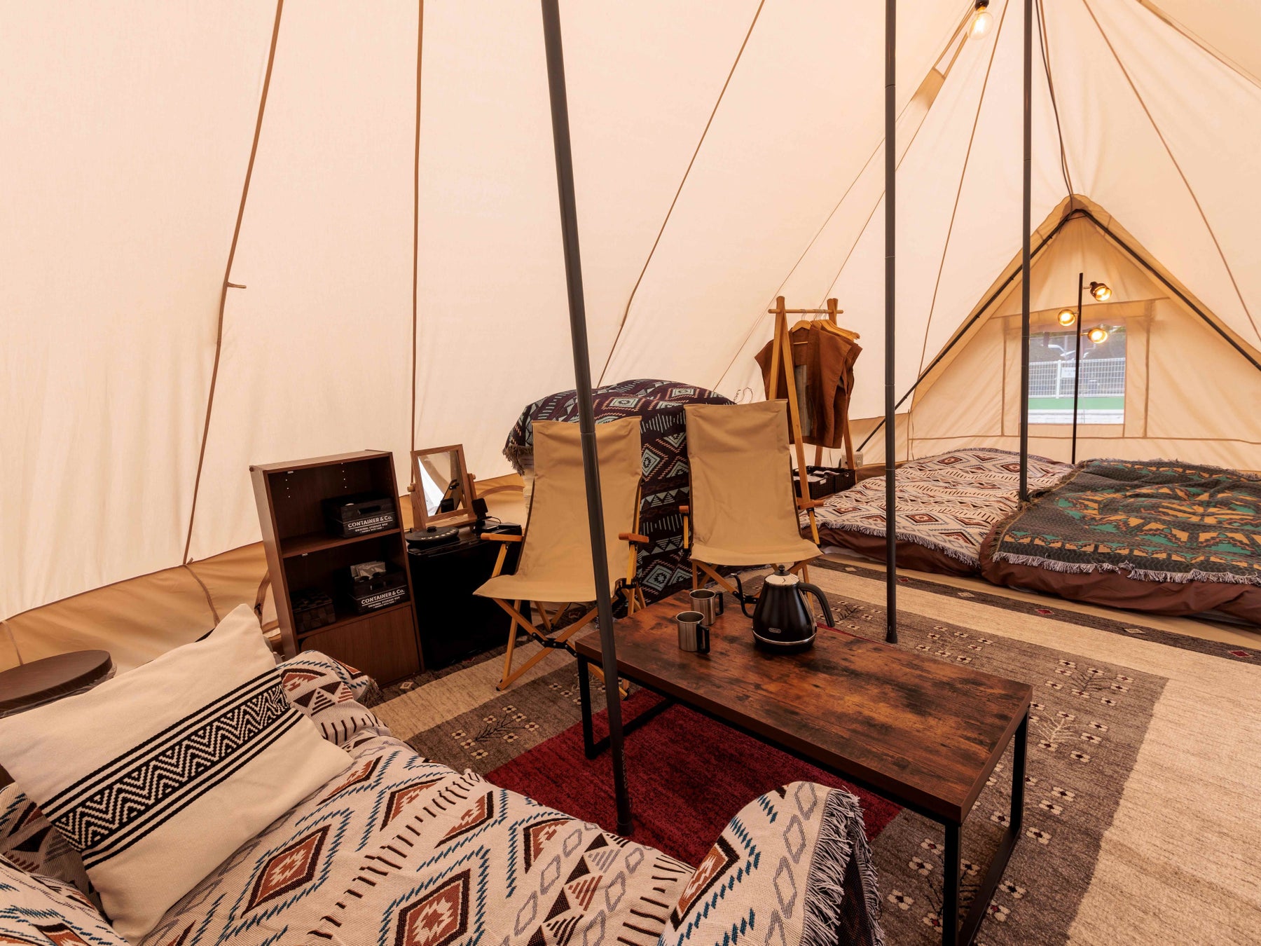 本格的なテントの中には、北欧風のテイストで揃えたソファーやアウトドアチェアー、寝具が揃っており、ゆったりとお過ごしいただけます。