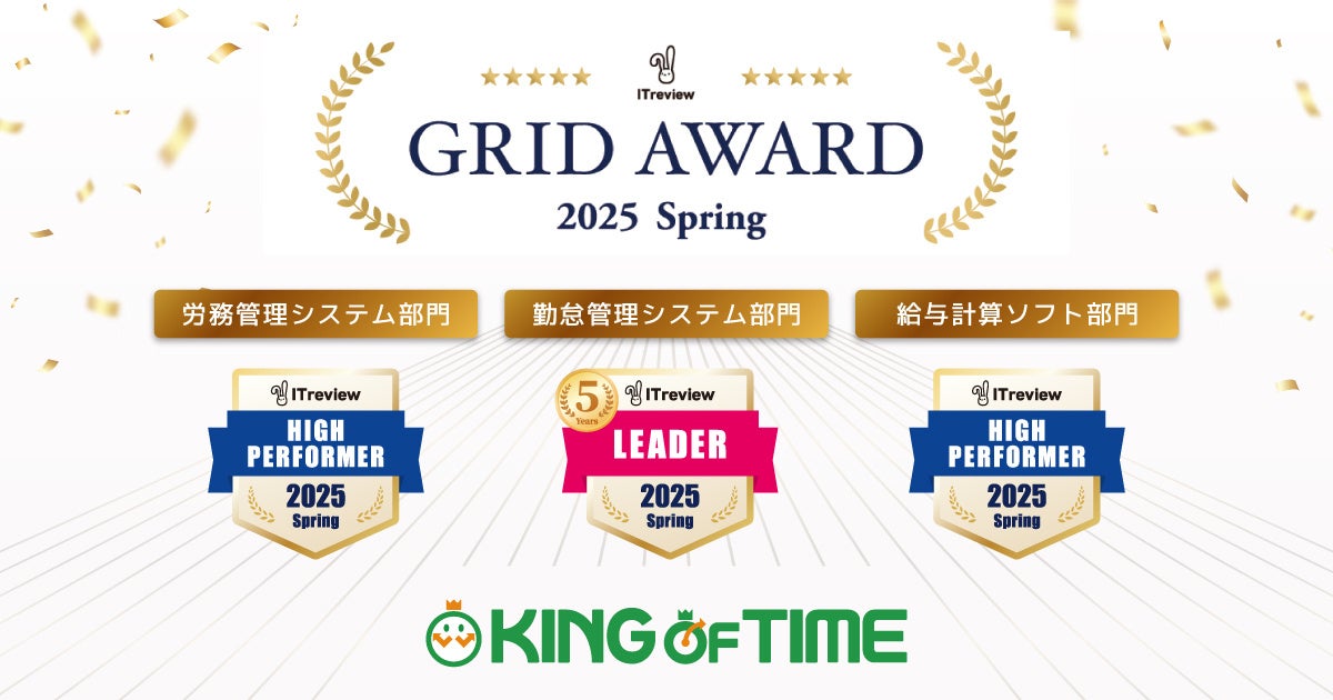 株式会社ヒューマンテクノロジーズ(本社:東京都港区、代表取締役社長:家﨑 晃一)が提供する勤怠管理・人事給与システム「KING OF TIME(キングオブタイム)」は、アイティクラウド株式会社(本社:東京都港区、代表取締役社長:黒野 源太)が主催する「ITreview Grid Award 2025 Spring」の勤怠管理システム部門にて最高位の「Leader」を24期連続受賞しました。また、同日発表された労務管理システム部門および給与計算ソフト部門にて「High Performer」を受賞したことをお知らせします。