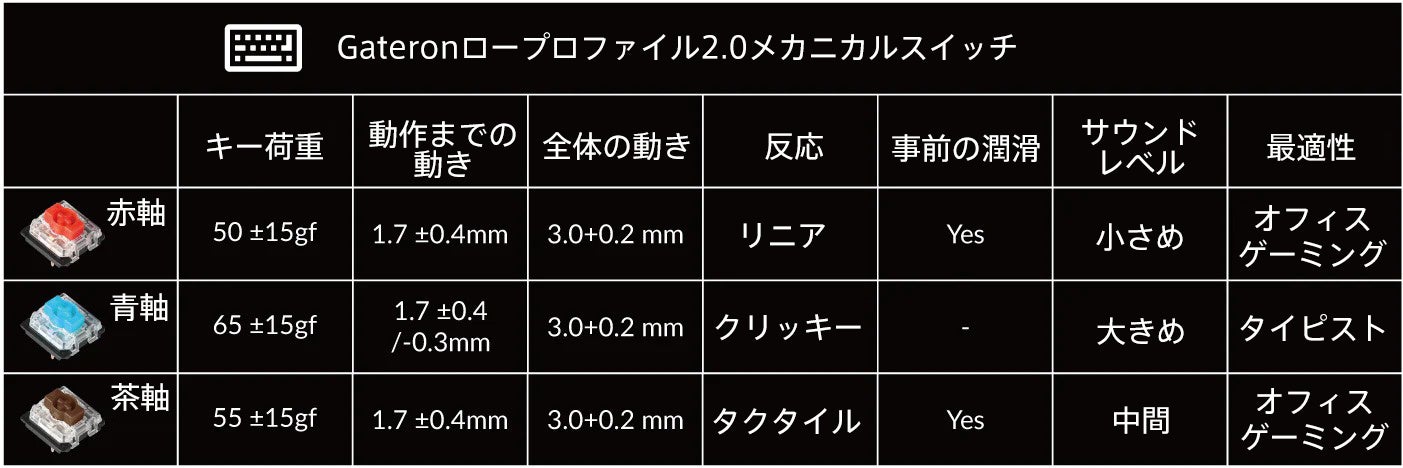 ※ Gateron ロープロファイルメカニカルスイッチにのみ対応し、オプティカルスイッチには対応していません。