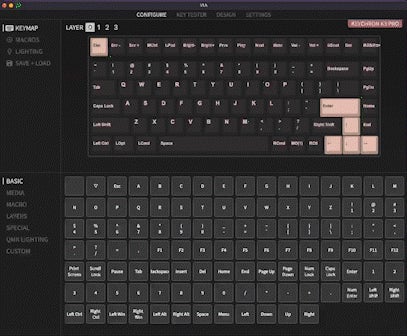 上図のような操作画面にてK3 Proキーボードの右上のライト効果キーをVIAソフトウェアでEjectキーにリマップしていきます。Macをスリープ状態にするショートカット(Command-Option-Eject)や、fnキーも簡単にリマップできるようになります。これほど直感的かつ柔軟に自分だけのキーマップをパーソナライズすることができるようになることは、これまでになかったことです。