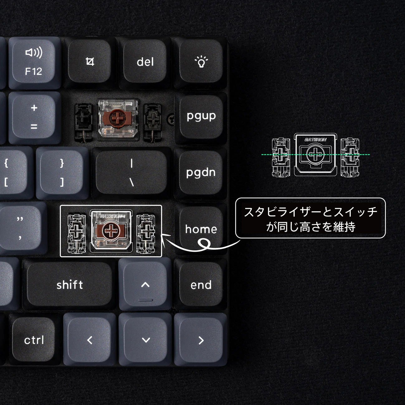 スペースバー、左Shift、バックスペース、Enterキーなどの大きなキーでもブレが少なく、信頼性を確保しつつ、スイッチと同じ高さを維持するようにスタビライザーを再設計しました。