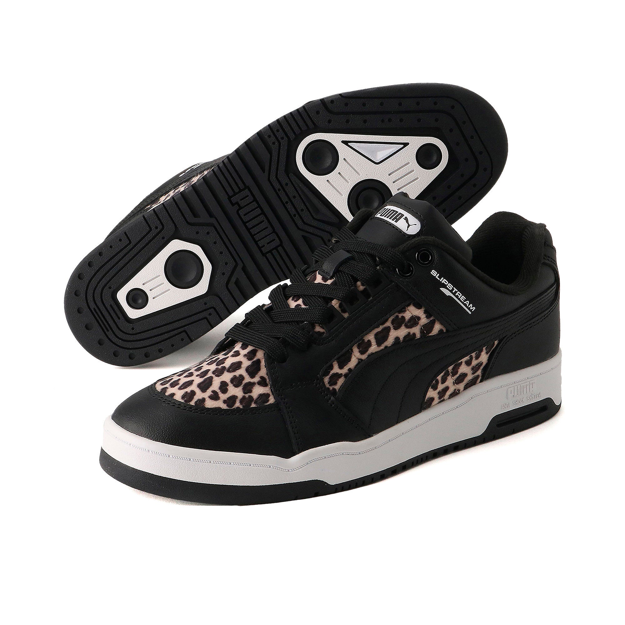 「SLIPSTREAM」は、1987 年に「SKY LX(スカイ ラックス)」の後継モデルとして誕生したバスケットボールシューズです。パフォーマンス、安定性、クッション性の高さから、コート上ではバスケットボールプレイヤーに愛用され、ストリートでもファッションスニーカーとして人気を博しました。今回発売される「SLIPSTREAM LO ANIMAL」は、日本のみで開発された限定モデルとなります。ブラックのレザートリムとポリエステル素材を使用したレオパードパターンのフェイクファーでリアルな質感を表現し、上品な1足に仕上げています。