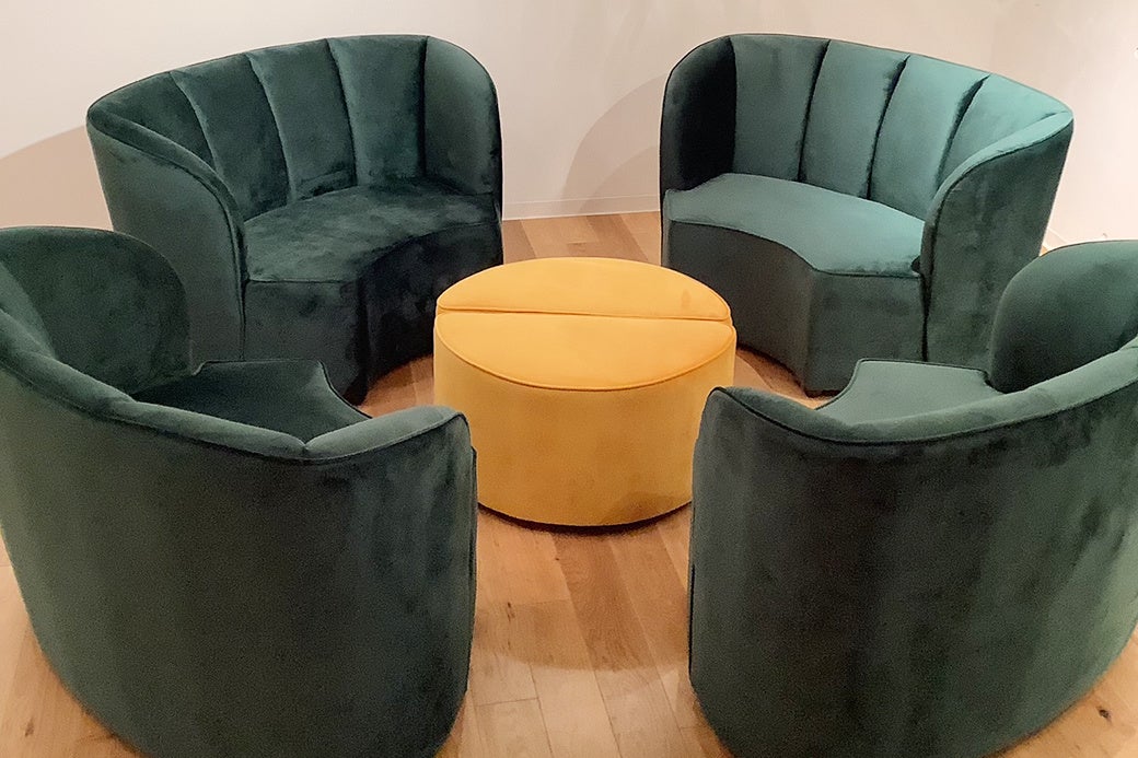 花という自然界で最も美しいものをモチーフにフルデザインでつくられた、ソファFLOWER。その花びらひとつひとつを1人掛けソファとし、中心の花芯のスツールをサイドテーブルまたはオットマンとして、フレキシブルに使えるようにデザインされたモジュールソファが誕生しました。1人掛けソファ4台、スツール2台がセットになった大型のソファです。フルオリジナルデザインのソファFLOWERは現在特許出願中です。