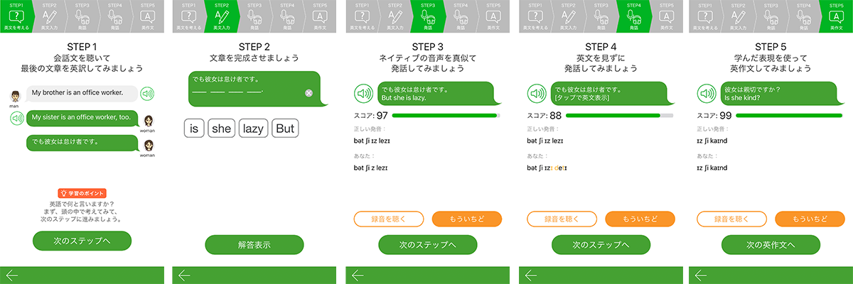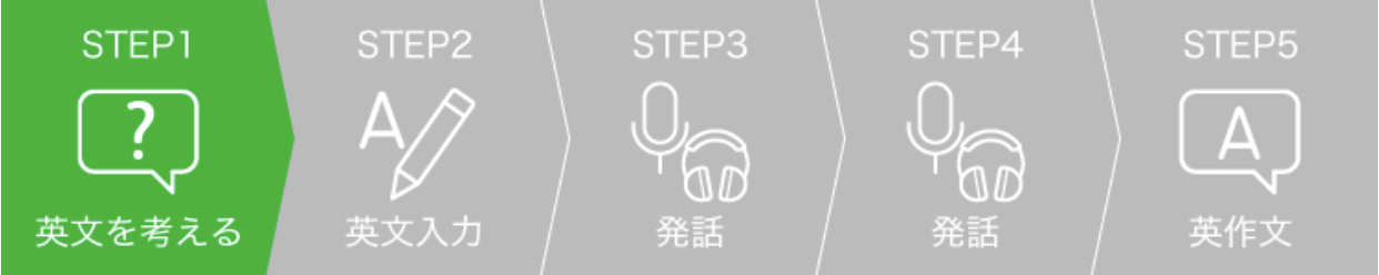 スピーキング特化コンテンツでは、1つの英文に対して5つのステップに分けて英語学習を行います。