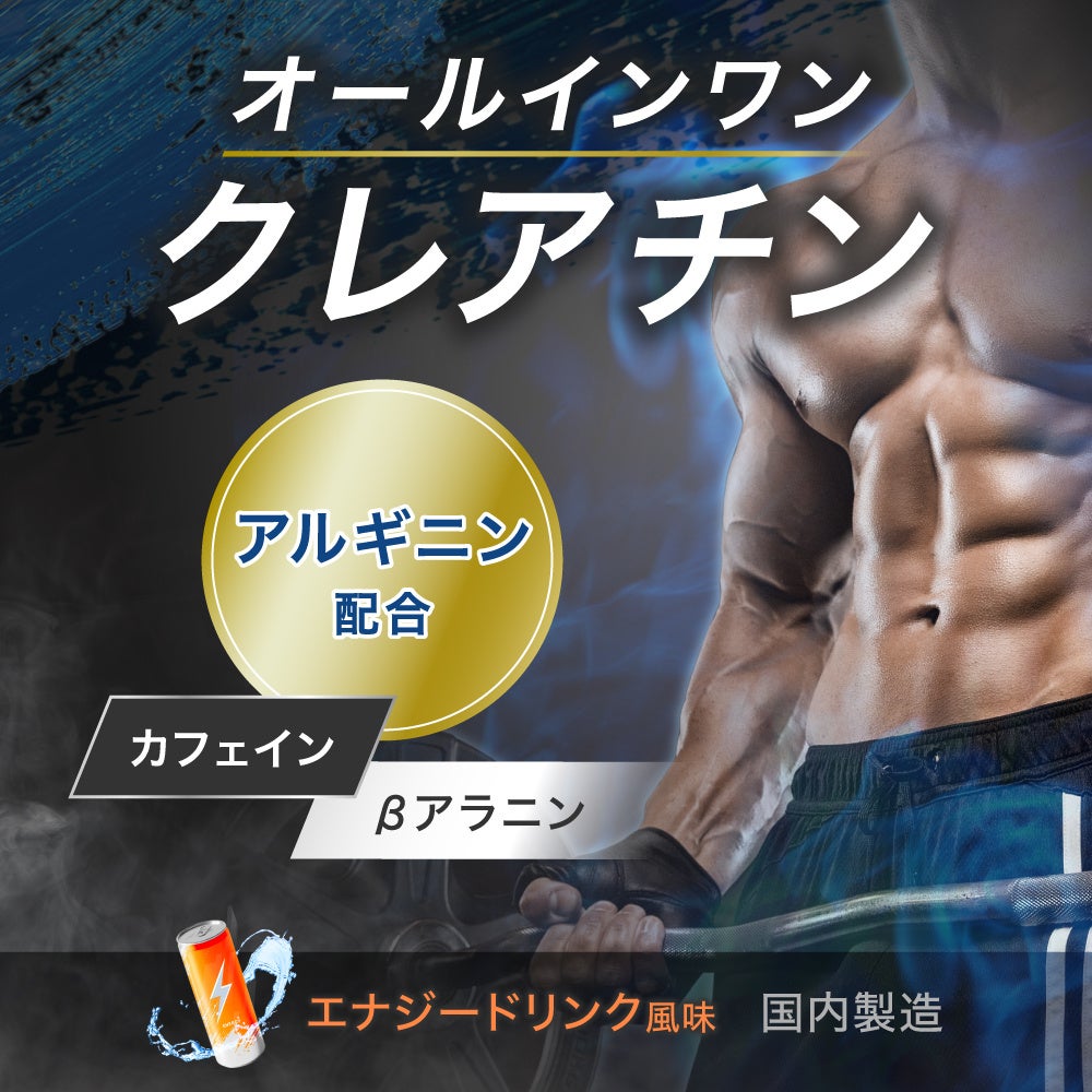 オールインワンシリーズに筋トレ前のエナジー補給に最適なサプリが新登場!アルギニンを配合したオールインワンクレア チンで、筋トレ前に効率良くエナジーをチャージ。β-アラニンによるピリピリ感とカフェインによる刺激でヤル気をサポート!フ レーバーは飲みやすいエナジードリンク風味。高品質の国内製造。