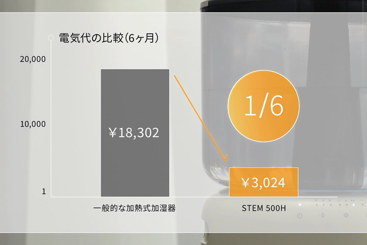 水を必要な分だけ加熱する超省エネ設計で、スチーム式加湿器と比較して6ヶ月の電気代を約1/6※3に抑えながら、雑菌の繁殖を抑制。清潔で安心なうるおいを届けます。
