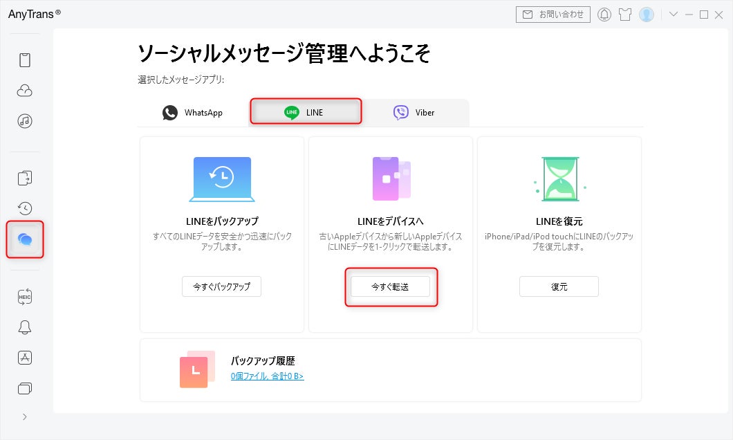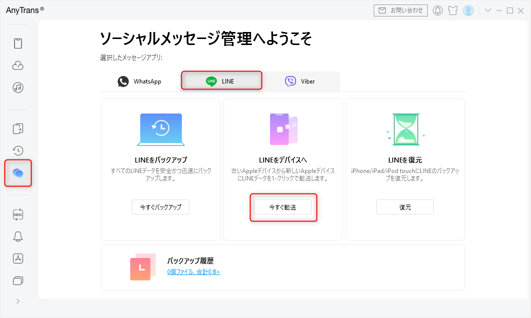 ③左のメニューから「ソーシャルアプリのデータ移行」を選択し、ソーシャルアプリの種類で「LINE」選択し、「LINEをデバイスへ」機能を選択し、「今すぐ転送」ボタンをクリックします。