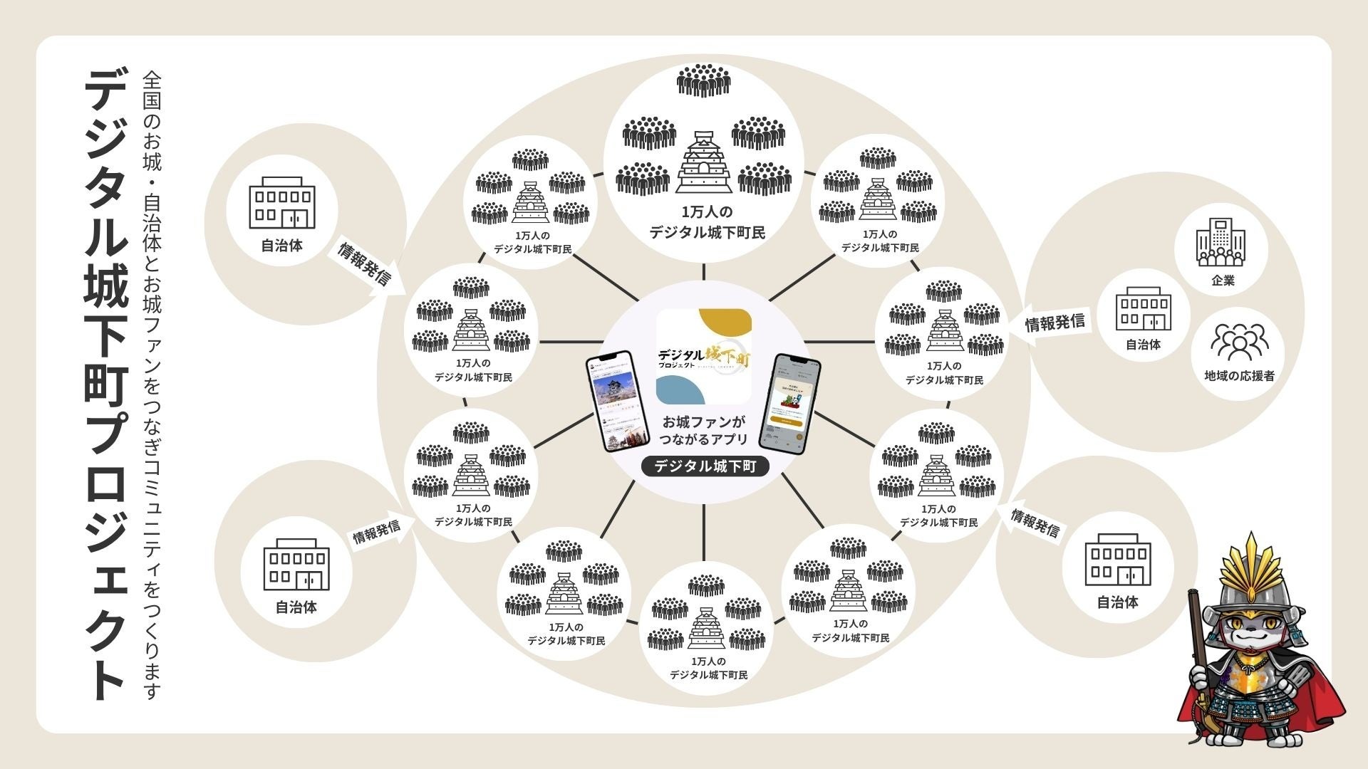 「デジタル城下町プロジェクト」は、株式会社バケットが株式会社電算システムと連携して展開するWeb3型地域創生プロジェクトの総称です。具体的には、全国の城郭を持つ自治体等と連携し、各お城で限定1万枚の「デジタル城下町民証」を発行。お城ファンを中心とする最大1万人に城下町民証を配布し、専用SNSアプリ「デジタル城下町」でオンラインコミュニティを形成します。