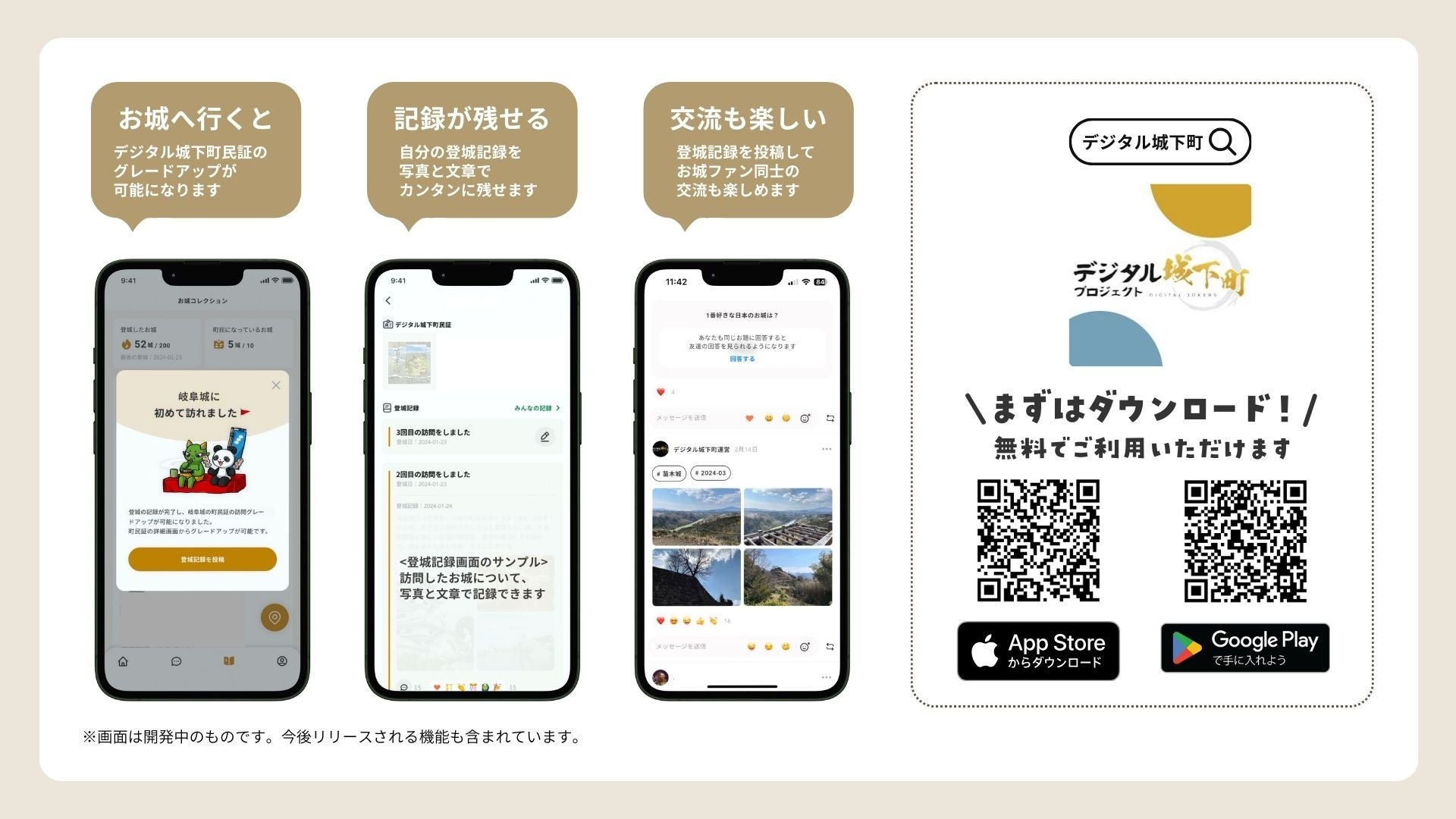 アプリは全国200城の訪問(登城)記録を残せる機能、「城活」を報告できる機能などを備えており、お城ファンが気軽にコミュニケーションを楽しめる場となっています。また、アプリとデジタル城下町民証を連携することで、登城またはプロジェクトへの支援時に城下町民証をグレードアップ(進化)することが可能です。城下町民証は複数保有することができるため、御城印を集めるようにコレクションできることも、お城ファンにとって大きな魅力となります。