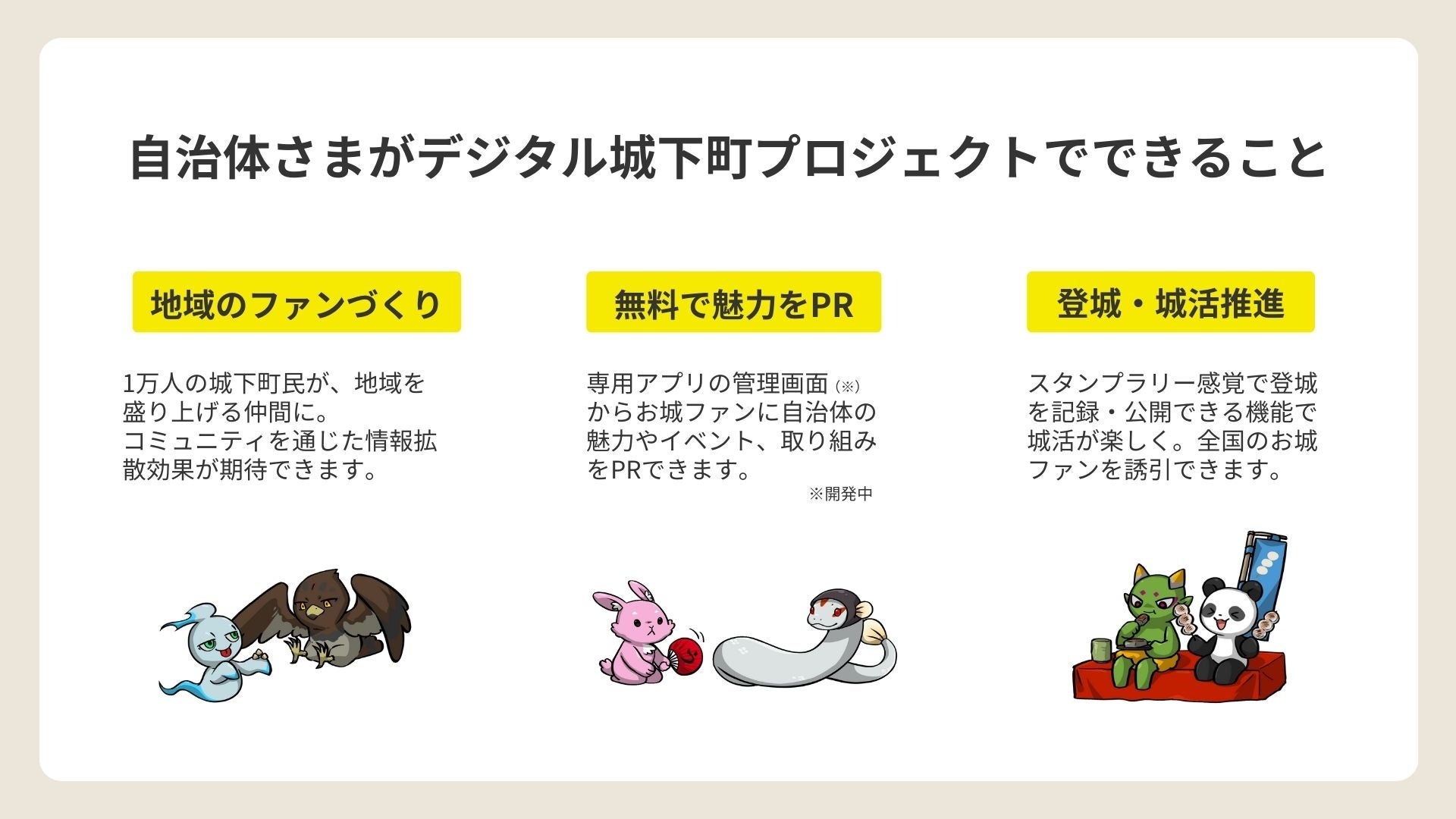 「デジタル城下町プロジェクト」は、国宝 犬山城(愛知県犬山市)、国宝 彦根城(滋賀県彦根市)、国宝 松江城(島根県松江市)をはじめとする、45以上の城郭で参画が決定しており、国内の自治体と連携した広域型の地域創生プロジェクトとなっています。